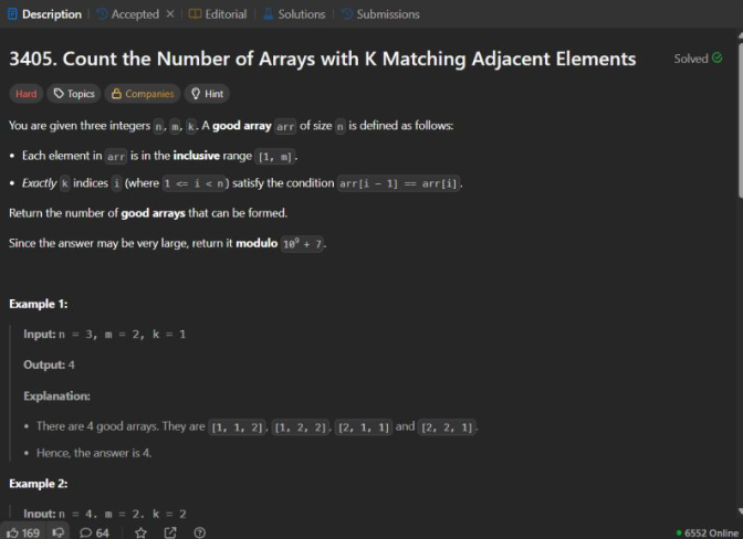 Problem: 3405. Count Arrays with K Matching Adjacent Elements📚 Topics: Combinatorics, DP, Modulo Math